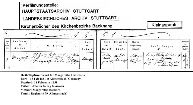 Her family came from the Allermbach area of Wurttemberg, Germany. I had found her siblings, parents and grandparents but I could not find her birth record until today. I am not sure why but the ancestry . com index would not come up with it. Since I already had the date and the birth register is chronological I looked for the date of birth and there she was. She is listed as simply Margarethe.