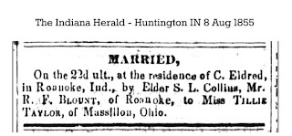 Married - On the 22nd ult., at the residence of C. Eldred in Roanoke IN, by Elder S.L. Collins, Mr R. F. Blount, of Roanoke, to Miss Tillie Taylor of Massillon OH. [note- this tells us that S.L. was still in the Ft Wayne area of IN, in Aug of 1855. by May of 1857, they had moved to IL, likely LaSalle Co.].